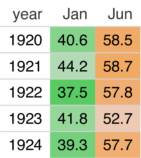 For example, here is a temperature heatmap using gt in R, and pandas in Python.